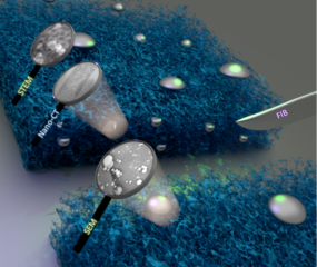 As part of the newly started project CRC 1452: “Catalysis at Liquid interfaces” (CLINT), this work presents a comprehensive structural and analytical characterization of the highly promising supported catalytically active liquid metal solutions (SCALMS) system. This novel catalyst shows excellent performance for alkane dehydrogenation, especially in terms of resistance to coking. SCALMS consists of a porous support containing catalytically active low-melting alloy particles (e.g., Ga-Pd) featuring a complex structure, which are liquid at reaction temperature. High-resolution 3D characterization at various length scales is required to reveal the complex pore morphology and catalytically active sites’ location. Nano X-ray computed tomography (nano-CT) in combination with electron tomography (ET) enables nondestructive and scale-bridging 3D materials research. A correlative approach using nano-CT, 360°-ET and analytical transmission electron microscopy (TEM) is applied to decipher the morphology, distribution and chemical composition of the Ga-Pd droplets of the SCALMS system over several length scales. Utilizing ET-based segmentations of nano-CT reconstructions, it is possible to reliably reveal the homogenous porous support network with embedded Ga-Pd droplets featuring a nonhomogenous elemental distribution of Ga and Pd. In contrast, large Ga-Pd droplets with a high Ga/Pd ratio are located on the surface of SCALMS primary particles, whereas the droplet size and the Ga/Pd ratio decreases while advancing into the porous volume. These studies reveal new findings about the complex structure of SCALMS which are required to understand its superior catalytic performance. Furthermore, advancements in lab-based nano-CT imaging are presented by extending the field of view (FOV) of a single experiment via a multiple region-of-interest (ROI) stitching approach.