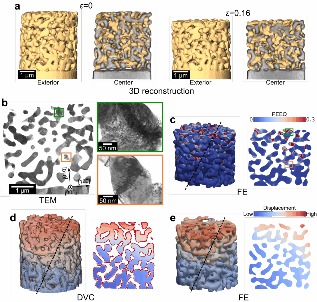 In a strong and long-standing international collaboration, IMN/CENEM researchers contribute to shedding light on these mechanisms. They employ a correlative and scale-bridging workflow combining non-destructive 3D electron and X-ray tomography, in situ mechanics and experimentally-informed real-size modelling to reveal the atomic origins of size dependent deformation mechanisms of nanoporous gold ranging from sub-ten to hundreds of nanometers. A realistic distribution of geometries and sizes of the ligaments appears to be crucial to accurately capture the mechanical response of nanoporous gold, including deformation gradients and plasticity. The established workflow demonstrates the potential for exploring the atomistic mechanisms of material plasticity with geometrical complexity.